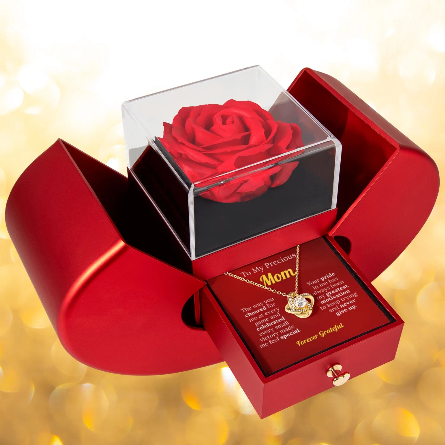 Watch her eyes well up with happy tears as she discovers this stunning heart necklace nestled under an everlasting rose. This isn't just jewelry - it's your way of saying "I am who I am because of you" in one unforgettable moment that she'll treasure forever.