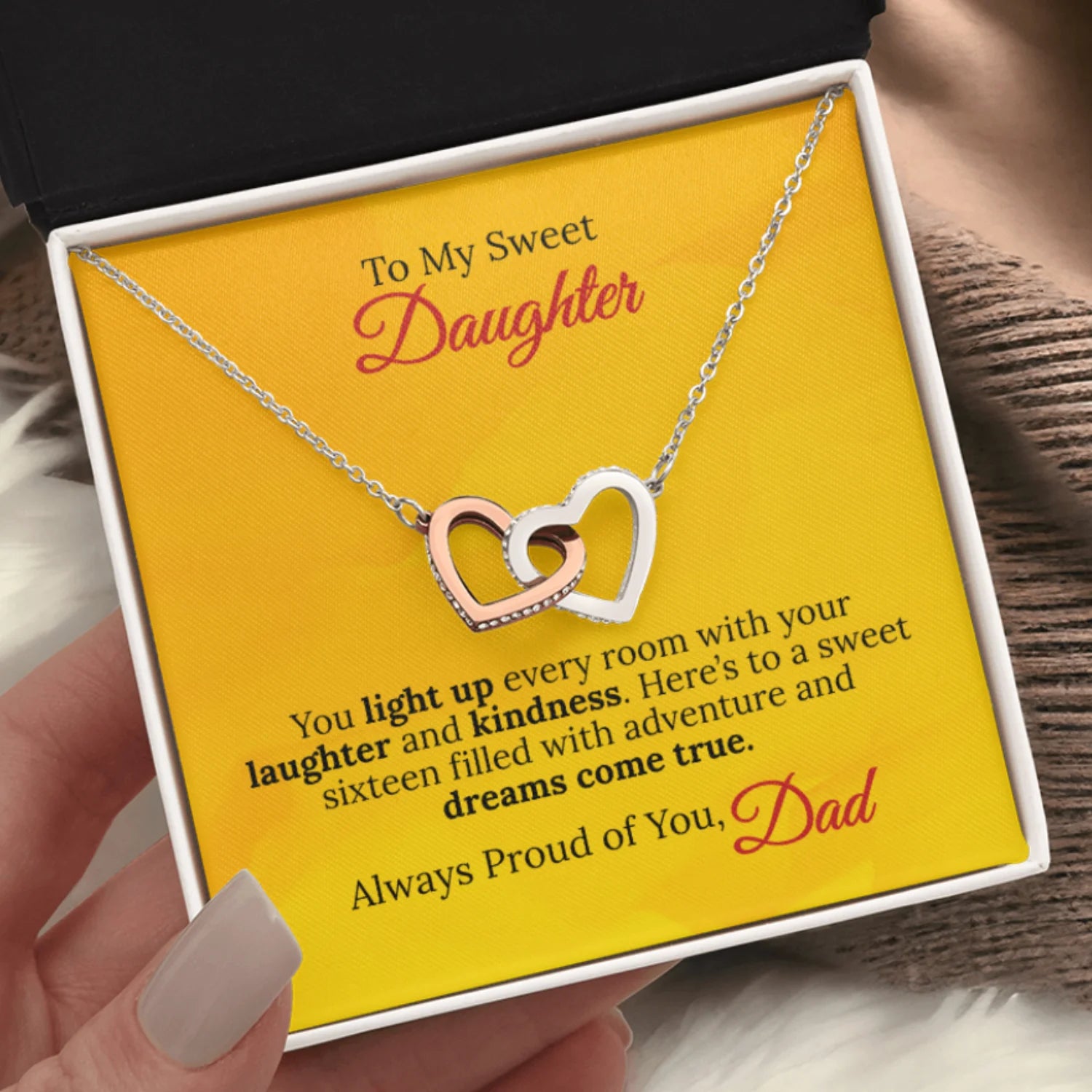 Capture the magic of her Sweet Sixteen with this breathtaking double heart necklace that sparkles as brightly as her spirit. Watch her face light up as she discovers this meaningful treasure - a beautiful reminder from dad that her dreams are just waiting to come true and her heart lights up your whole world.