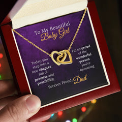 This stunning double heart necklace honors both who she's always been to you - your beautiful baby girl - and who she's becoming as she steps into this exciting new chapter. The intertwined hearts represent your eternal bond: one heart for the daughter who will always be your little girl, and another for the strong, wonderful person she's growing into. When she wears it, she'll carry your pride and love into every new adventure.